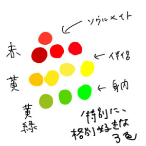 なんでこんな赤ホイホイか不明ですが(突き抜けて好いている)(赤だったらそれでいい気がする)(赤という免罪符)、近年黄色にもすごく心躍るようになり(自分の中の好感度が異常)、黄緑色もめっきめっき大好きです。信号機最高じゃねーの…アレほんと俺ホイホイだと思う…