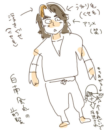 ギリは右寄り3:7の場所にあるんだけど、多分、左側の毛は彼の髪質からしてもっさ~としてるんでしょうね、左側の髪の根元に浮き癖はなさそう。でも外ハネ方向へのうねり癖はあるっぽい。放っておいたら巨人の星の花形みたいになってまうんじゃないでしょうか。ゲゲゲのキタローみたいに目元が隠れてしゃうんじゃないかな、と勝手に解釈しました。ほいでセンターの辺りの前髪は短いから、なんとか視界を覆わない細工はしてるのかな、という・・・勝手な解釈を・・・いや、合理的だなーと思いました・・・ごにょごにょ。