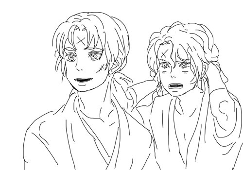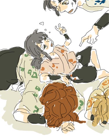 枕を涙で濡らす義丸とつい寝てるマと寝呆けの網問と現状把握に努める鬼さん