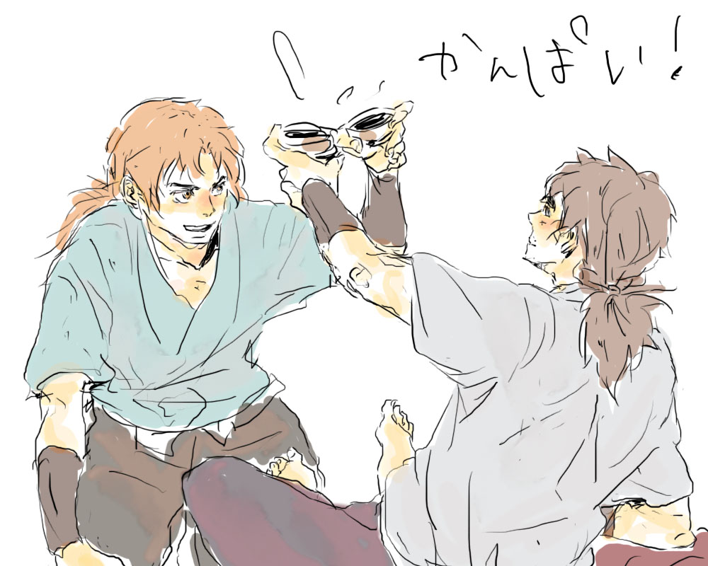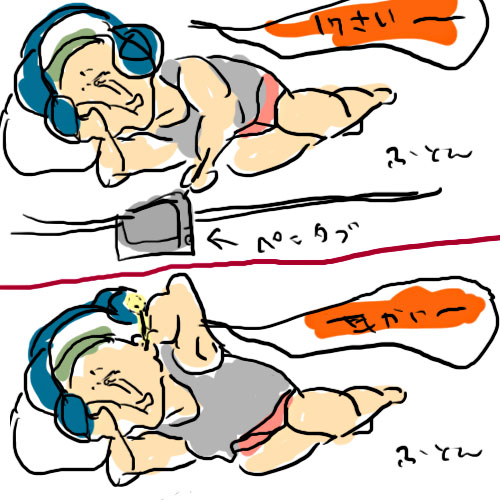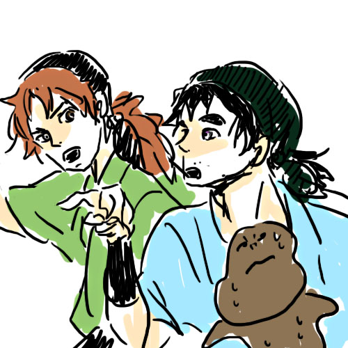 線がヒョロってるのはアルコールのせいじゃなくて左側に寝転がって頬杖ついて敷布団の上に無造作に置いて半分くらい床に転げ落ちてるペンタブとアイロン台の上に乗せているパソコンで描いているせいです。これ結構…首が痛い…かもしれない…だがダルくて起きていられない…でも落書きはしたい…ジレンマ…