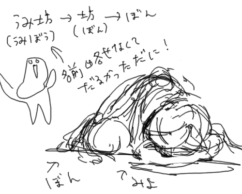 うみ坊のさわり心地はどんな感じなのでしょうね。絵本によると彼は長時間水に浸かっているとブヨブヨに肥大化するらしいので(←海の妖怪としてどうなのか)、両生類っぽいのかな?と思ったりするのですが、カエルとかその辺??